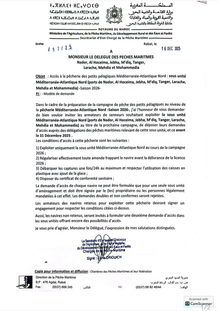توصلت غرفة الصيد البحري المتوسطية، بمراسلة رسمية صادرة عن كتابة الدولة المكلفة بالصيد البحري بوزارة الفلاحة والصيد البحري والتنمية القروية والمياه والغابات، تتعلق بإحالة مشروع