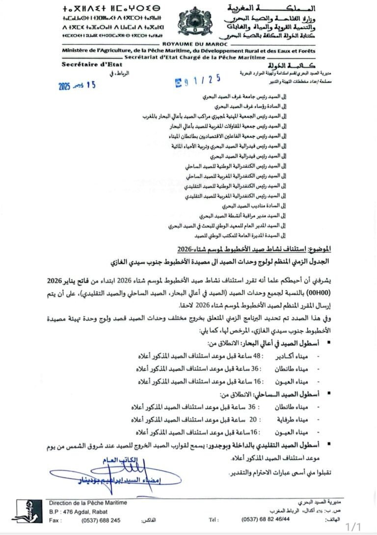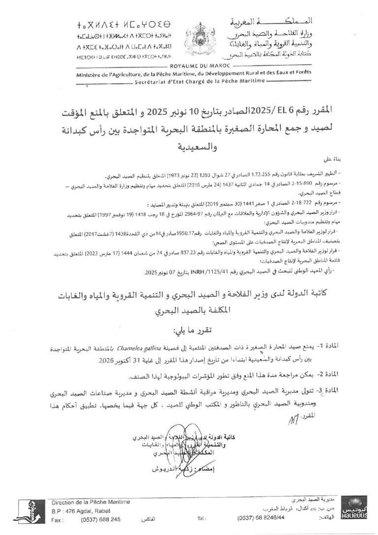 توصلت غرفة الصيد البحري المتوسطية بدعوة رسمية من لدن المكتب الوطني للصيد، لحضور اجتماع يخصص لعرض حصيلة الإجراءات المتفق عليها خلال الاجتماع المنعقد بتاريخ 29 أكتوبر 2025، والذي خُصص