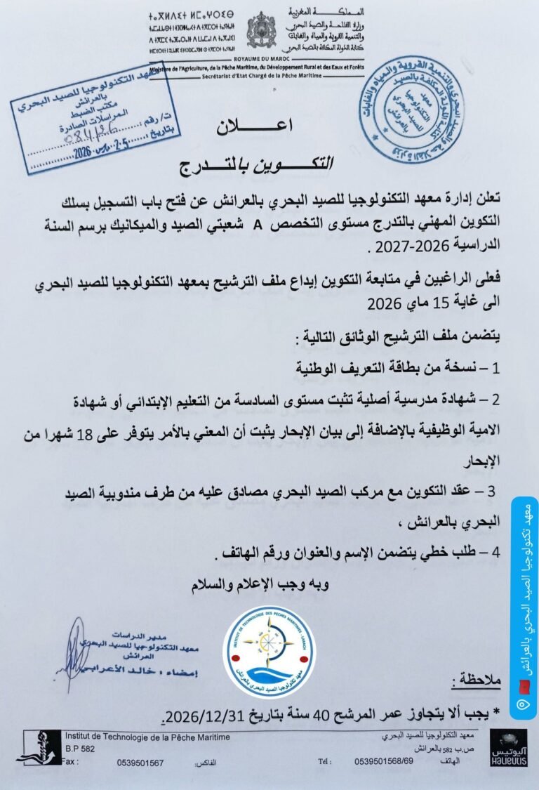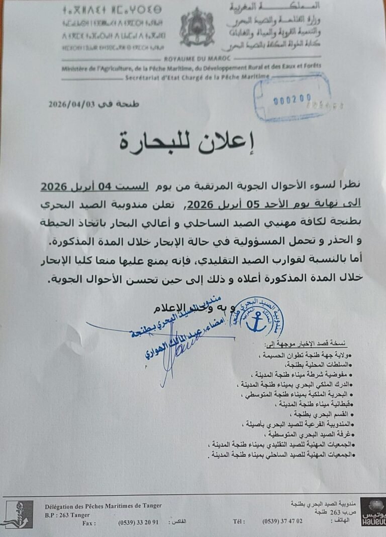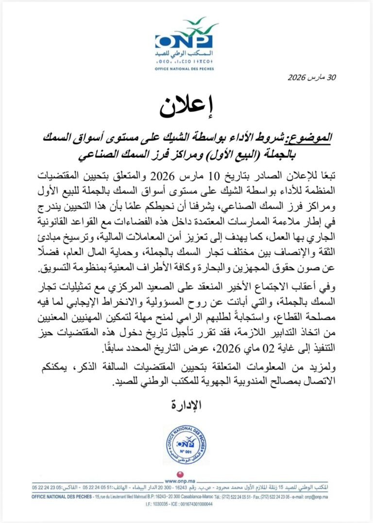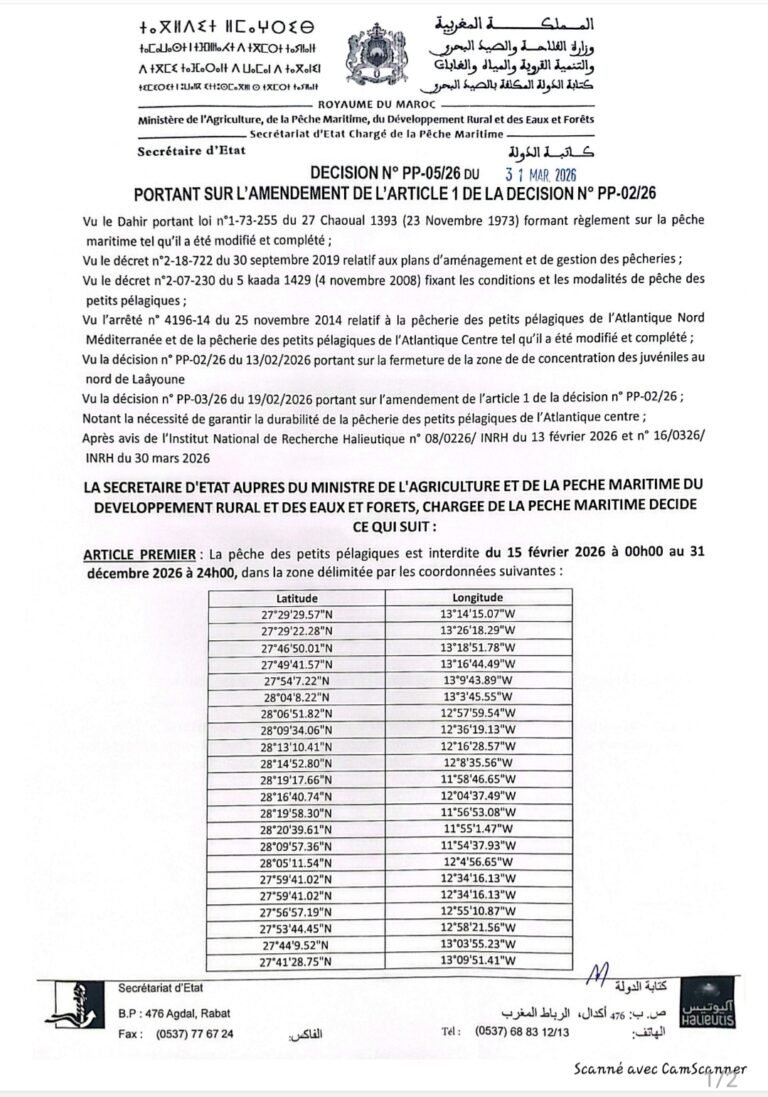 أعلنت كتابة الدولة المكلفة بالصيد البحري، عن رفع الحظر عن جمع وصيد وتسويق الصدفيات من نوع “الفيرني” على مستوى المنطقتين المصنفتين أمتار شرقا – الجبهة و جنان النيش – أمتار غربا، التابعتين