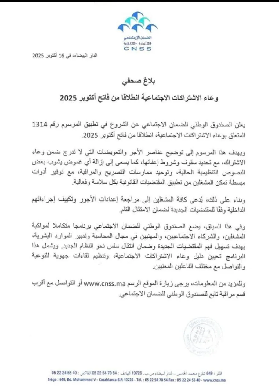 بلاغ من CNSS حول وعاء الاشتراكات الاجتماعية انطلاقا من فاتح أكتوبر 2025 الجمعة 17 أكتوبر 2025 Share this… Whatsapp Gmail Facebook Twitter Linkedin