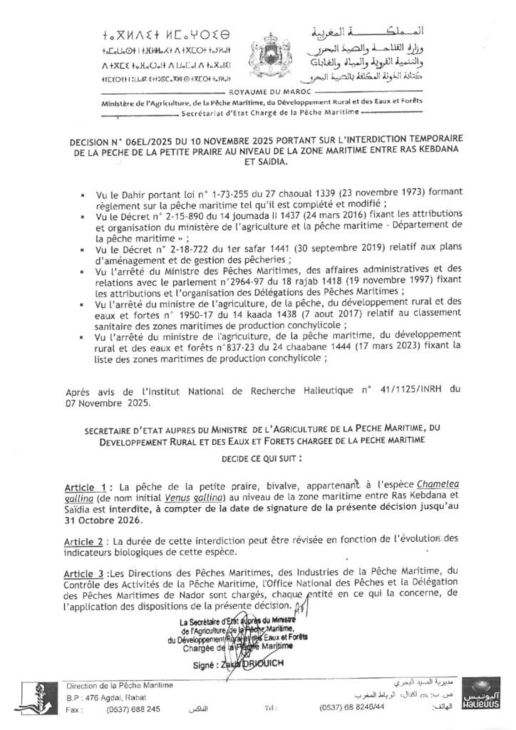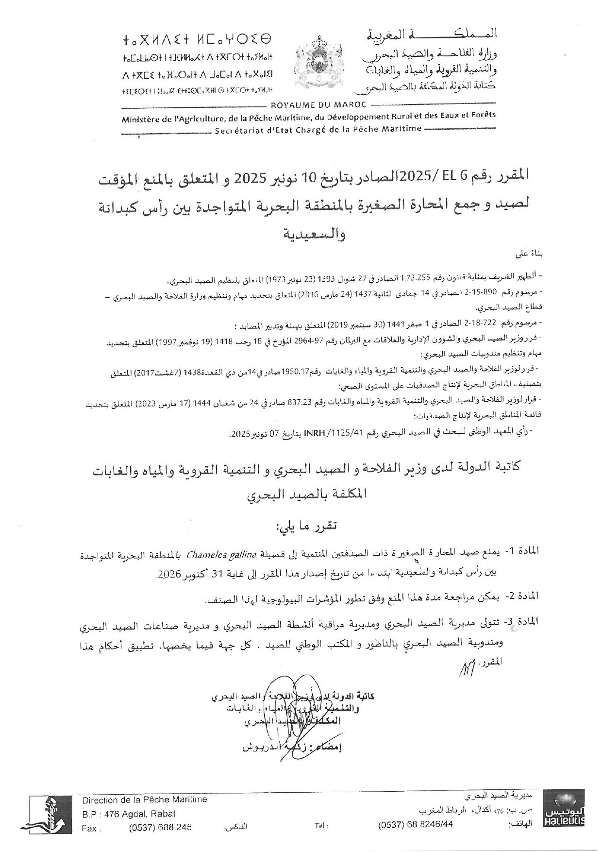 المقرر المتعلق بالمنع المؤقت لصيد وجمع المحارة الصغيرة بالمنطقة البحرية المتواجدة بين رأس كبدانة والسعيدية الجمعة 19 ديسمبر 2025 Share this… Whatsapp Gmail Facebook Twitter Linkedin