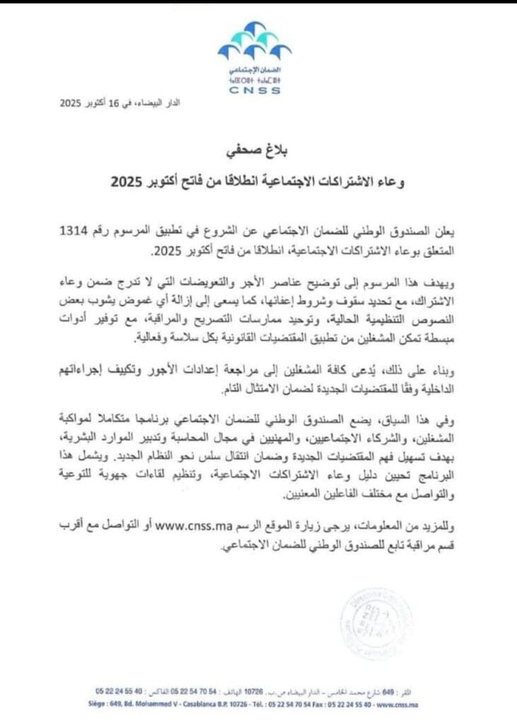 بلاغ من CNSS حول وعاء الاشتراكات الاجتماعية انطلاقا من فاتح أكتوبر 2025 الجمعة 17 أكتوبر 2025 Share this… Whatsapp Gmail Facebook Twitter Linkedin