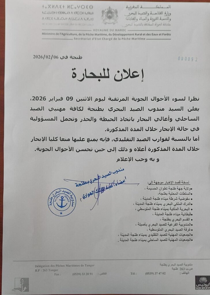 إعلان عن سوء الأحوال الجوية بميناء طنجة الأحد 8 فبراير 2026 Share this… Whatsapp Gmail Facebook Twitter Linkedin