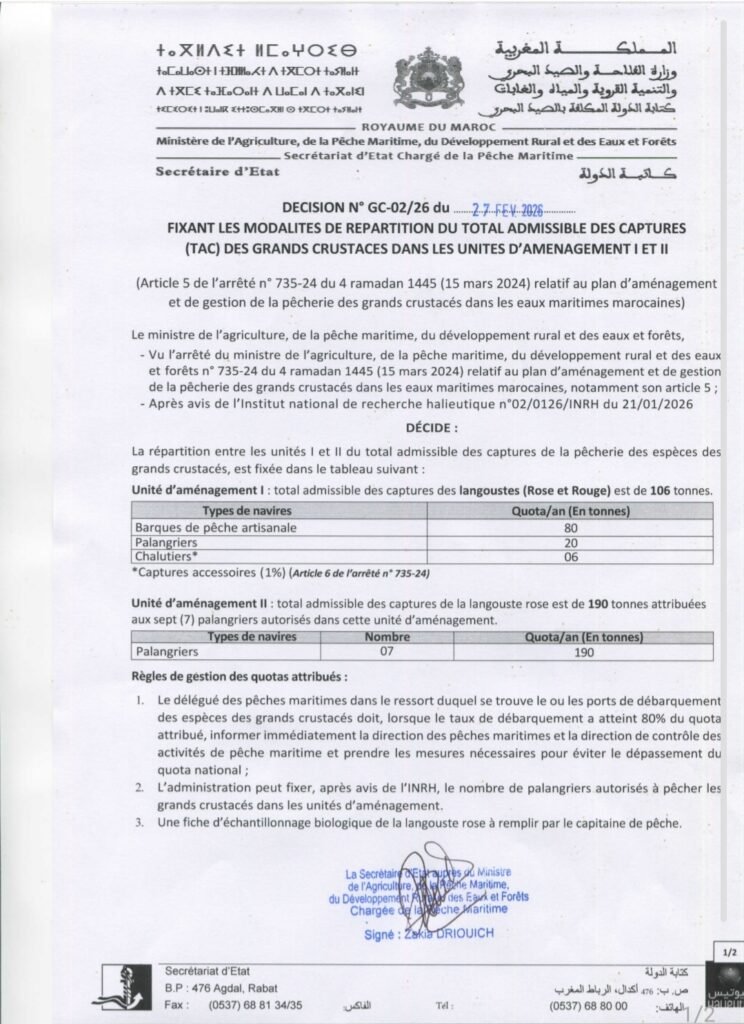 المقرر المتعلق بتحديد كيفيات توزيع الحاصل الإجمالي المسموح به من مصطادات كبار القشريات في وحدتي التهيئة 1 و 2 الجمعة 27 فبراير 2026 Share this… Whatsapp Gmail Facebook Twitter Linkedin