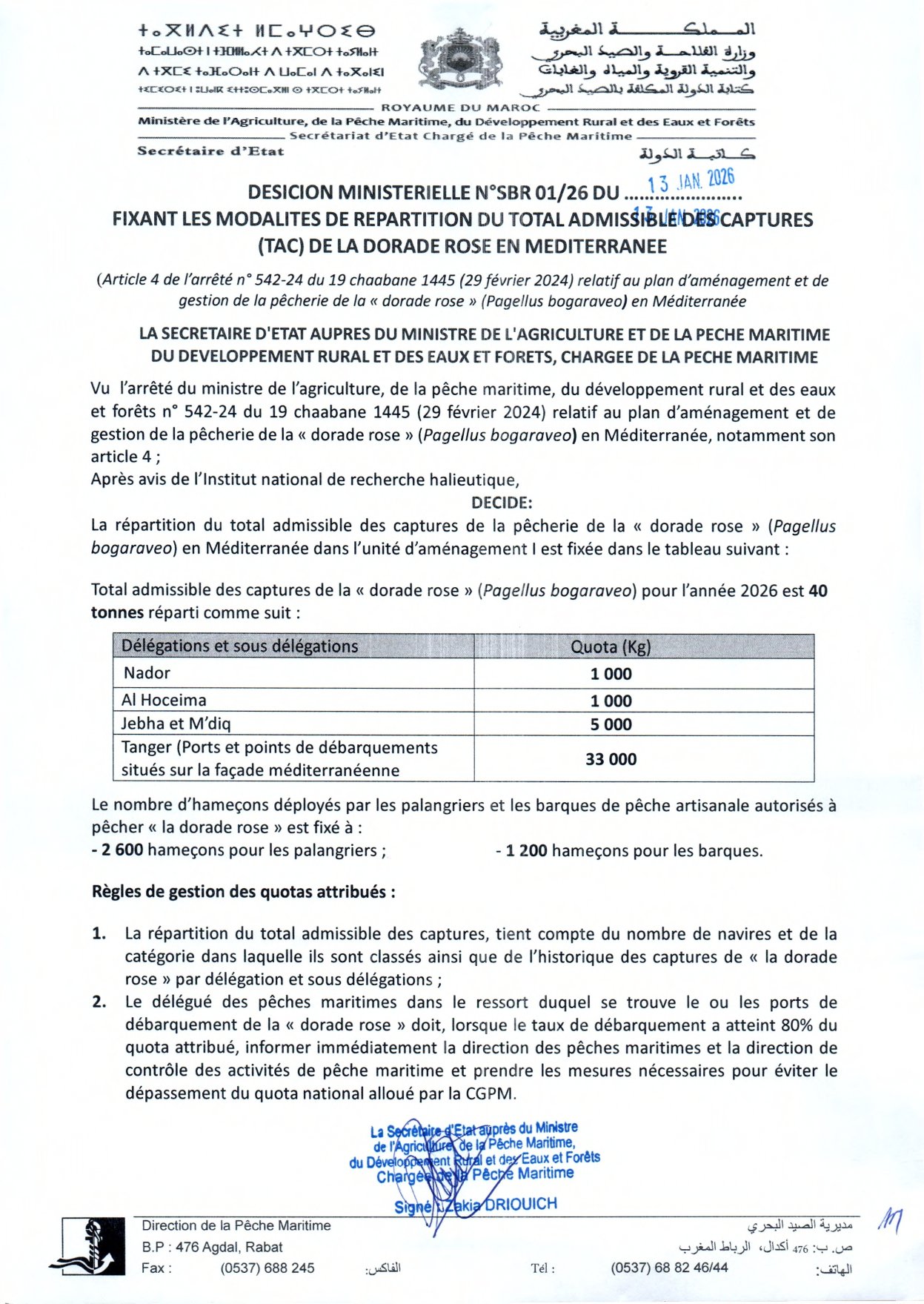 المقرر الوزاري المتعلق بتحديد كيفيات توزيع الحاصل الجمالي المسموح به من مصطادات ( TAC) لسمك ” الزريقة الوردية”  في وحدة  التهيئة I  لموسم 2026