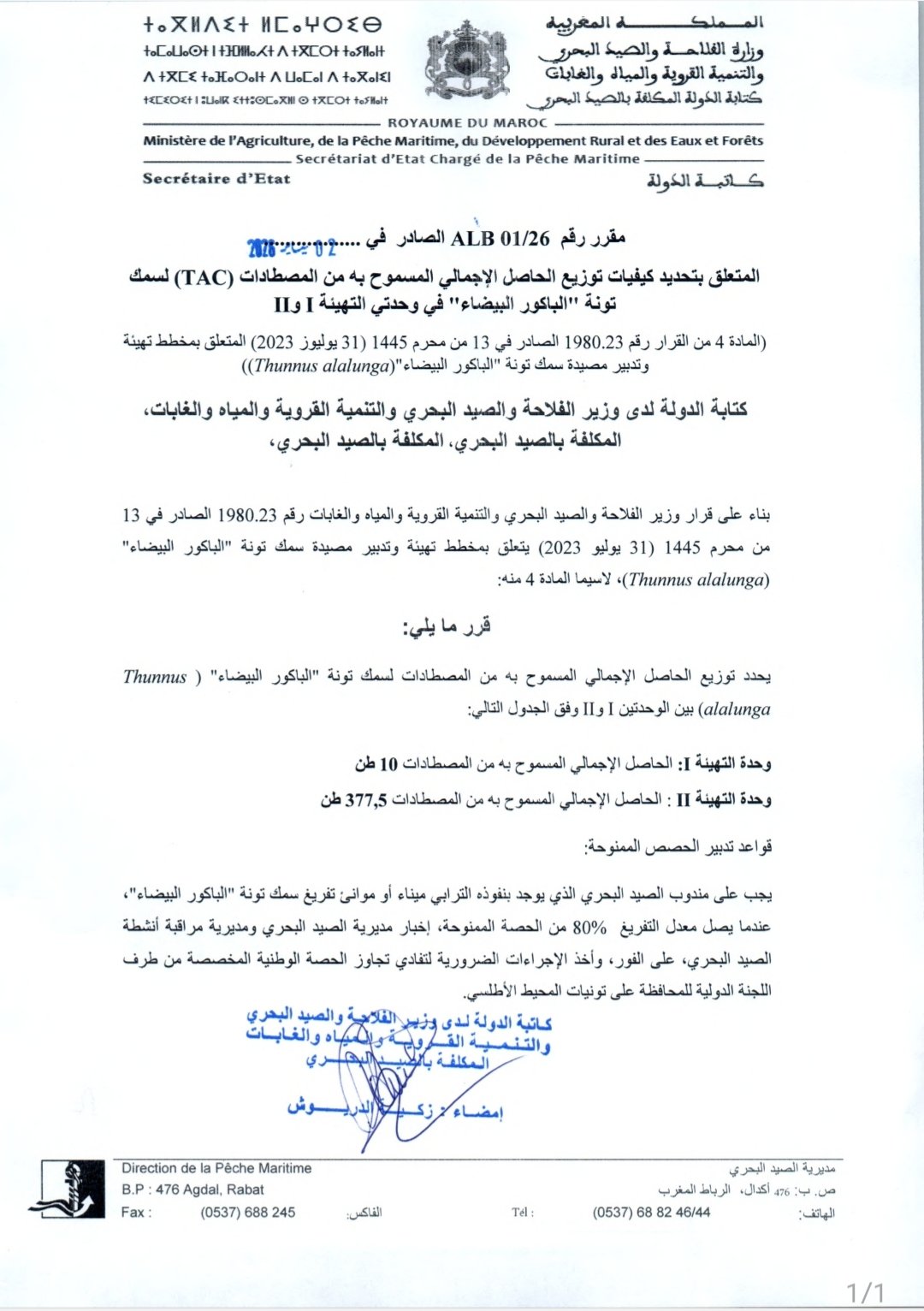 المقرر الوزاري  المتعلق  بمخطط تهيئة وتدبير سمك تونة البكور  (Germon -Thunnus alalunga)،   في وحدتي التهيئة 1 و 2