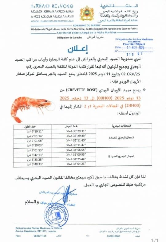 • إعلان عن منع صيد الأربيان بالدائرة البحرية بالعرائش (إعلان وإحداثيات)