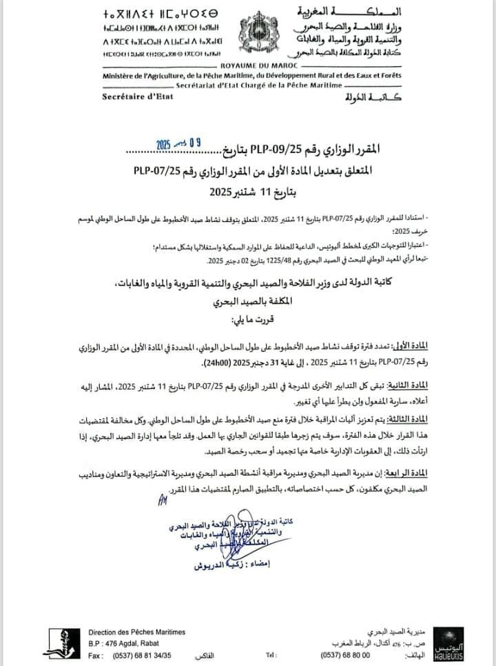 المقرر الوزاري المتعلق بتوقف نشاط صيد الأخطبوط على طول الساحل الوطني